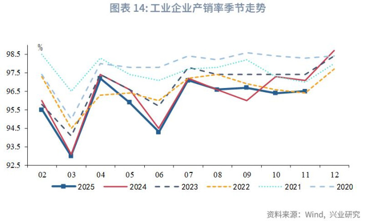 11月工业企业产销率录得96.5%,较上月回升0.1个百分点,仍位于近年同期较低水平。