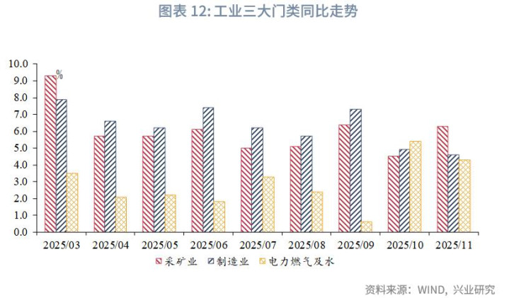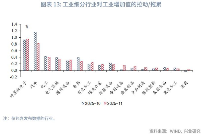 从工业三大门类来看,采矿业同比增速回升1.8个百分点至6.3%,制造业、电热气水生产和供应业同比增速分别回落0.3个、回落1.1个百分点至4.6%和4.3%。公布数据的制造业细分行业中,计算机电子、汽车对工业增加值的拉动显著,对应11月集成电路和汽车的出口表现较好。