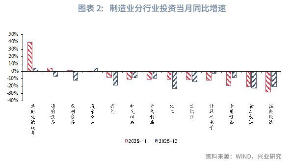 2025年11月,全国固定资产投资当月同比录得-11.1%,较上月提高0.1个百分点,制造业、基建投资当月降幅皆小幅收窄;累计同比降幅扩大至2.6%。