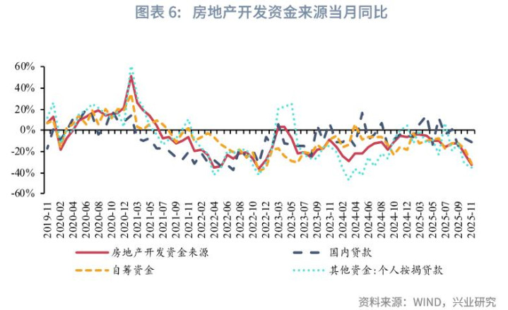 投资方面,11月投资边际企稳,当月同比录得-11.1%,较上月提高0.1个百分点,结束自2025年4月以来的连续下降。财政加力有所显效,基建投资当月同比较上月提高0.2个百分点,其中交运仓储投资回升较为明显。制造业投资当月降幅较上月收窄2.2个百分点,其他运输设备、通用设备、农副食品、有色、化工同比回升较多。房地产投资降幅延续走扩,房地产开发资金来源进一步回落。10月固投资金来源中,国家预算内资金当月同比明显回升显示财政资金将对年末投资形成支撑,而自筹资金降幅扩大指示投资的内生动能仍有待提振。
