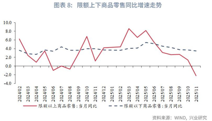商品大类上,各品类增速均较上月有所走弱,其中以家电、汽车为代表的补贴商品降幅较大。临近年末,各地补贴剩余额度紧张,且补贴商品零售的同比基数较高,家电音像和汽车同比增速分别录得-19.4%和-8.7%。汽车方面,10月以来多数省份调整置换补贴发放方式;11月黑龙江省、湖北省、北京市、湖南省等先后发布公告,暂停实施报废补贴政策[1]。家电方面,进入11月多地宣布资金额度“用完即止”,暂停家电以旧换新政策。中央经济工作会议提出“优化‘两新’政策实施”,明确消费品以旧换新政策将在2026年延续,2026年度补贴资金额度到位后有望促进社零反弹。