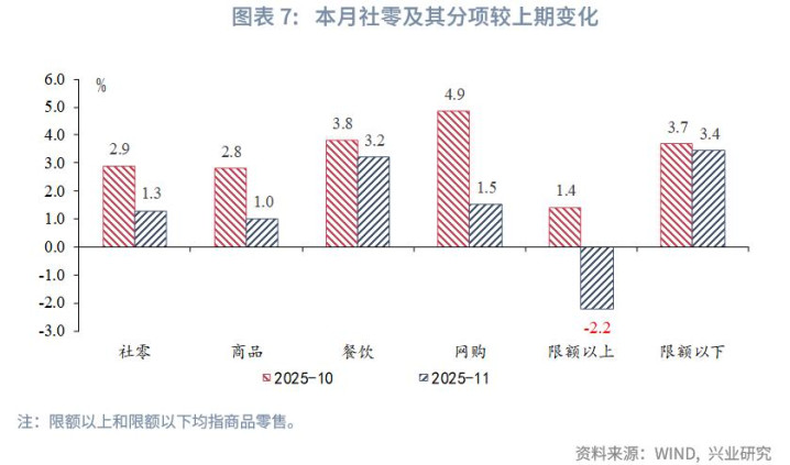 商品消费方面,11月商品零售同比增速下行1.8个百分点至1.0%。其中,由于以旧换新对限上零售影响更大,限额以上单位商品零售同比下降3.6个百分点至-2.2%;但限额以下单位商品零售同比增长3.5%,保持较强韧性。