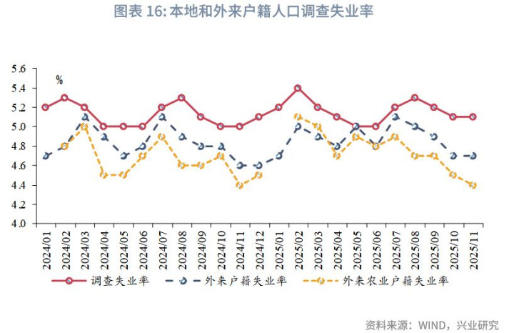 失业率持平上月。11月城镇调查失业率录得5.1%,持平上月。本地户籍人口失业率持平于上月的5.3%;外来户籍人口失业率亦持平上月的4.7%,外来农业户籍人口失业率继续下降0.1个百分点至4.4%。